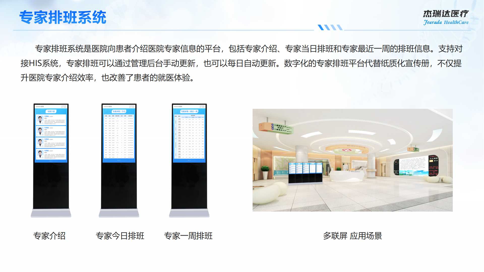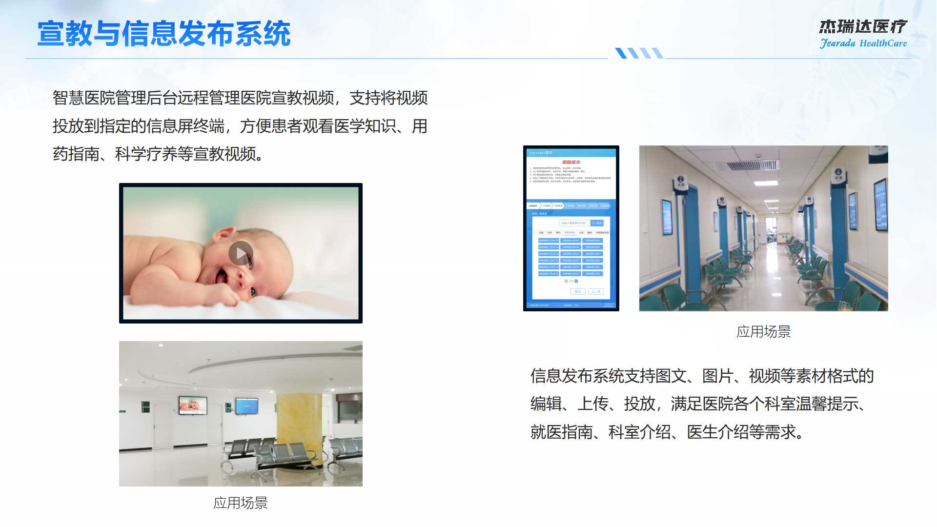 医院管理者可以通过管理后台将医院的健康宣教和通知提示、专家排班情况发布到线上移动就医小程序、线下多功能自助智慧终端和显示终端,实时向患者发布医院最新动态、健康常识、温馨提示、用药注意事项等信息。