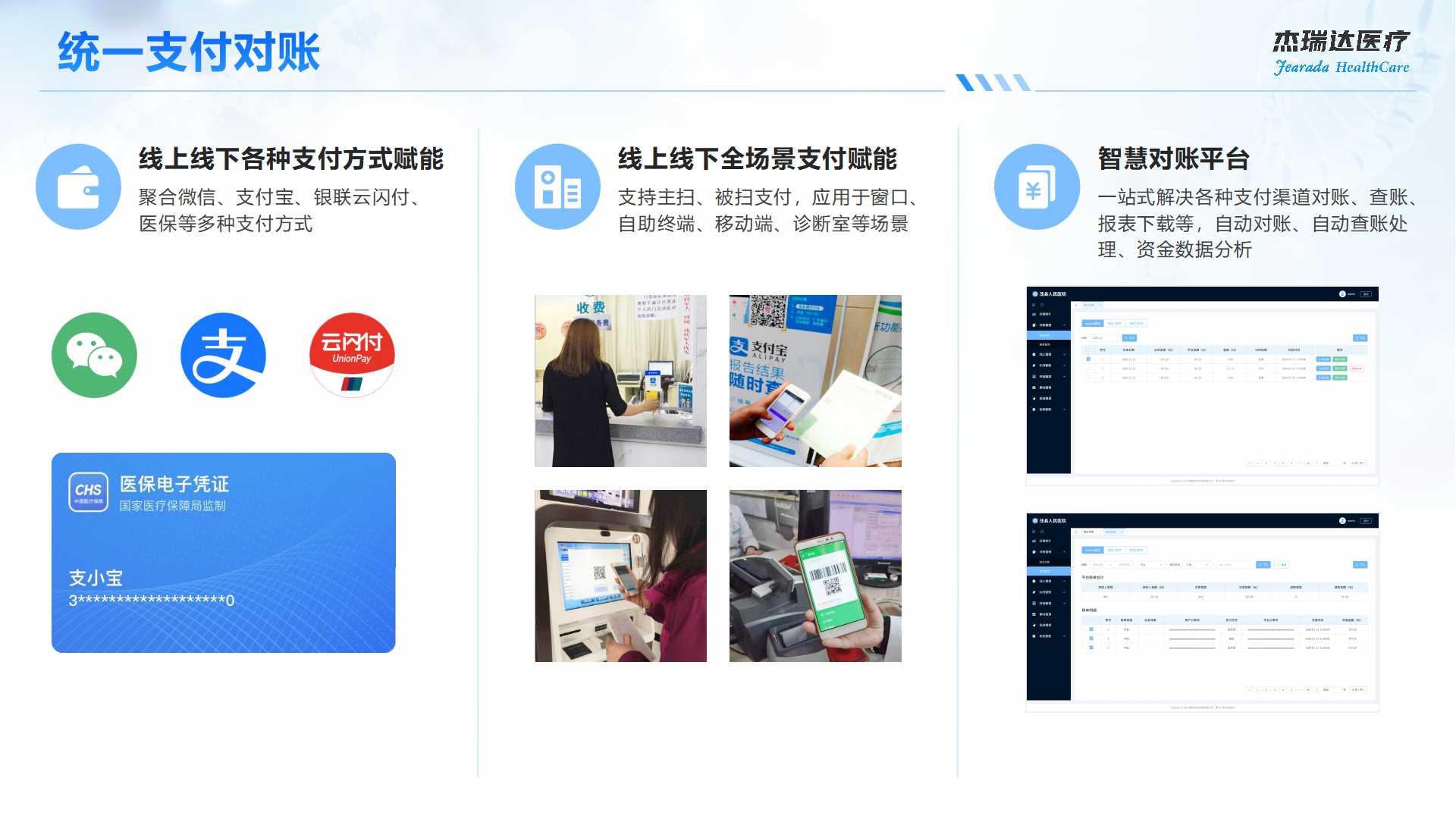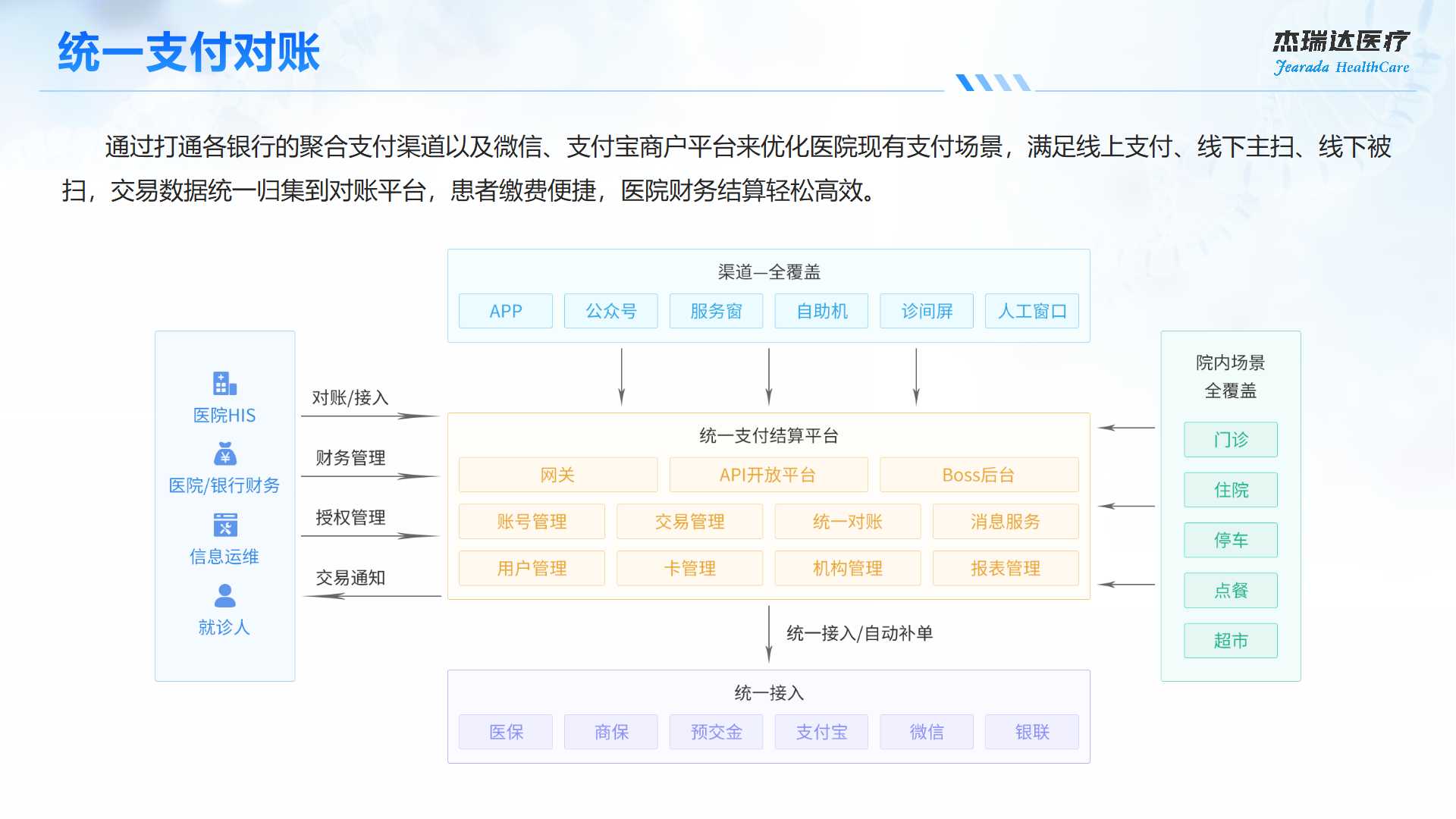 基于HMIS管理平台统一接入银联、微信、支付宝、医保等渠道,满足线上支付、线下主扫、线下被扫,交易数据统一归集到对账平台,患者缴费便捷,医院财务结算轻松高效。