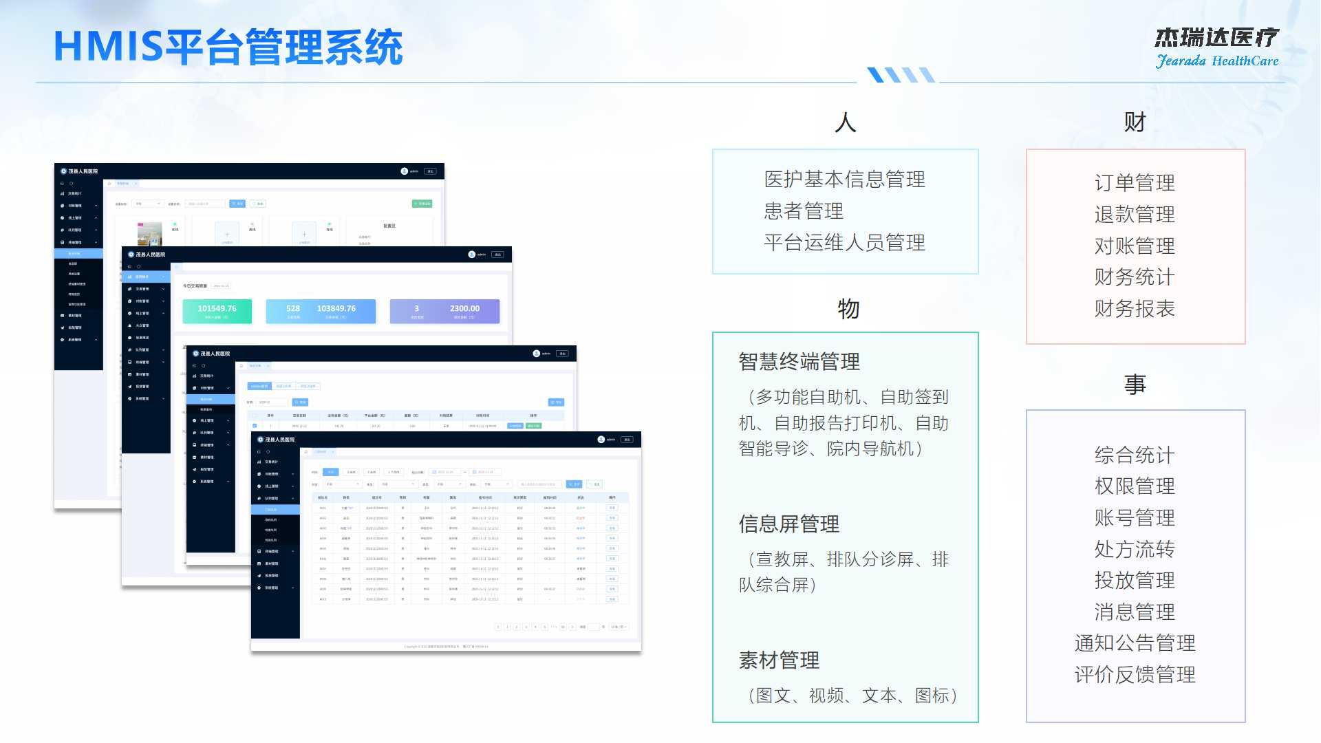 线上/线下自助服务系统、分诊排队叫号系统、支付对账系统、自助签到系统、互联网医院等统一管理后台系统。
