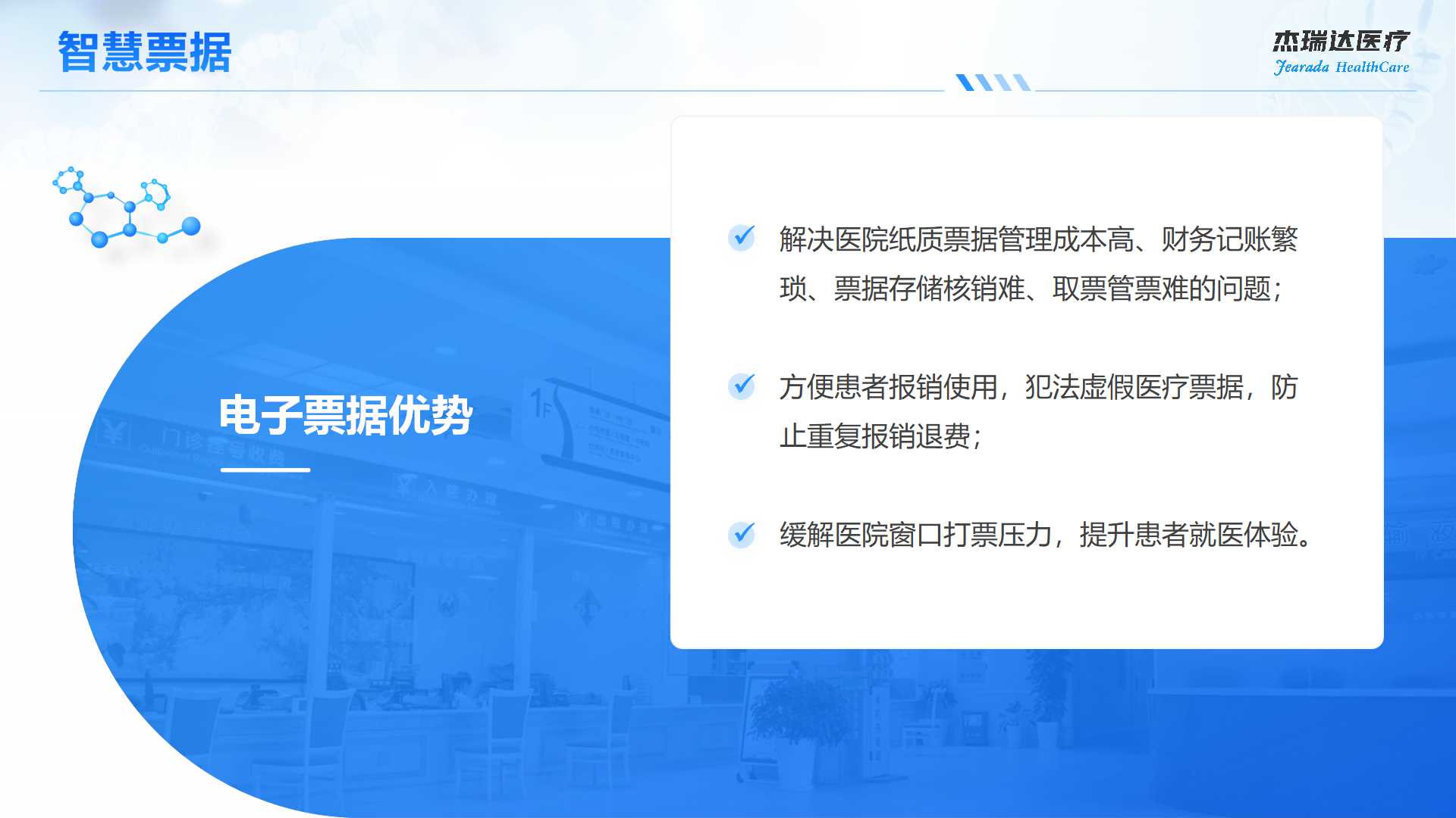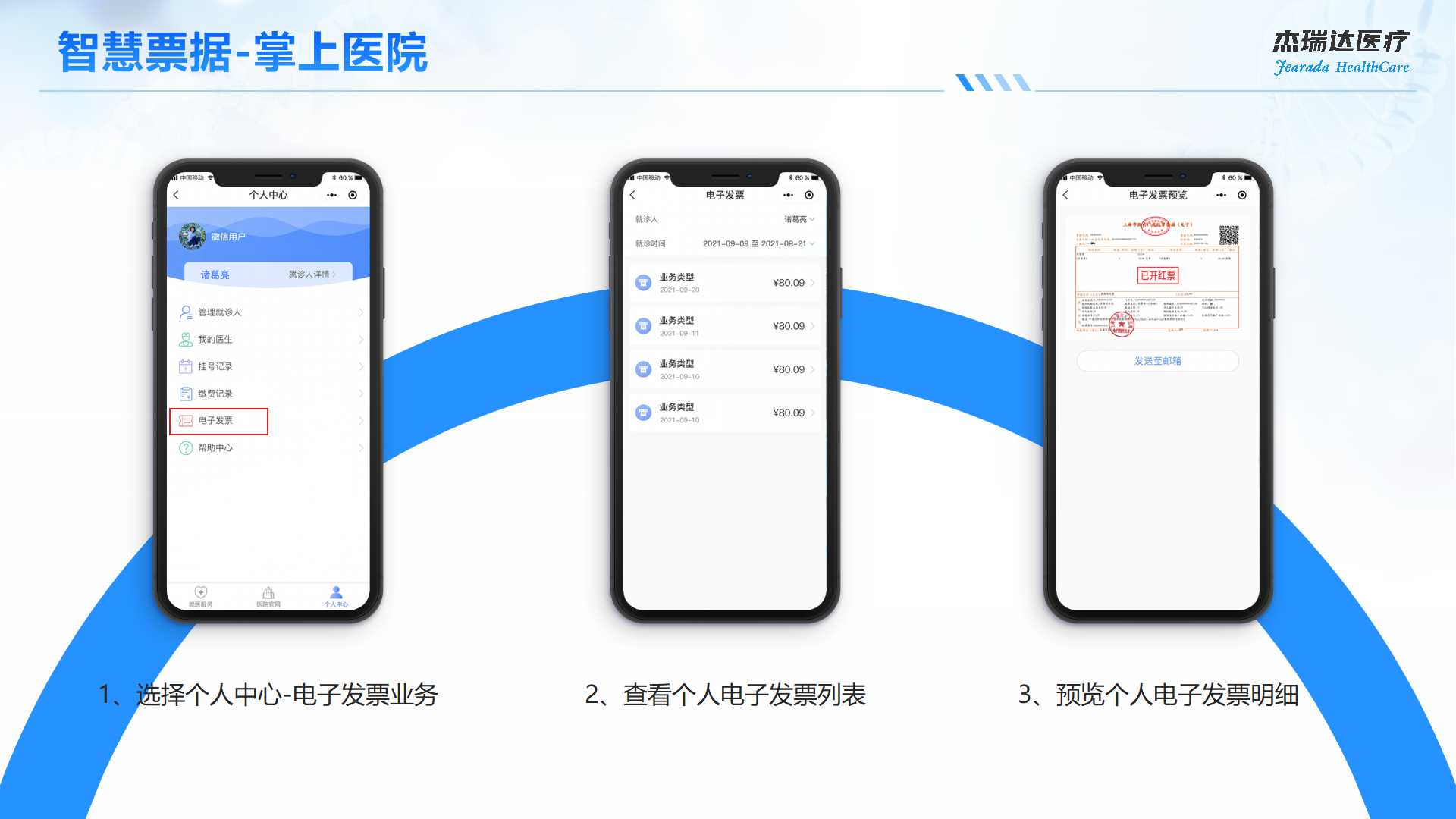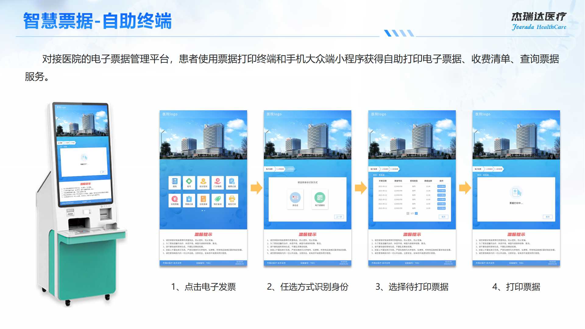 对接医院的电子票据管理平台,患者使用票据打印终端和手机大众端小程序获得自助打印电子票据、收费清单、查询票据服务。